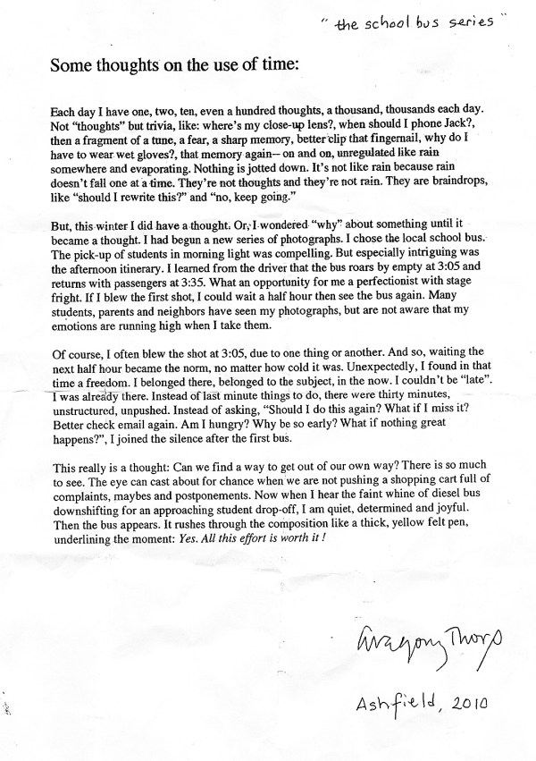 Gregory Thorp, 65, is a photographer of musicians, the botany of corn, and the Mississippi River, but when he wants to experience trial and error and hope on a daily basis, he photographs the Ashfield school bus.