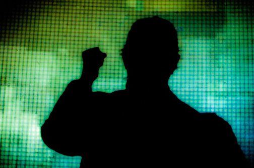Angry Frank (self-portrait) with a detail of Kari Gatzke’s projection/installation.
